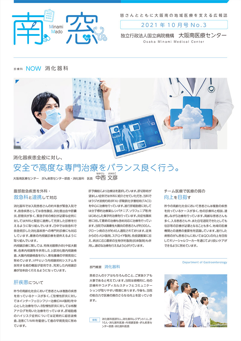 広報誌「南窓」は、「皆さんとともに大阪南の地域医療を支える広報誌」として、2020年9月より、毎月500部、発行しております。